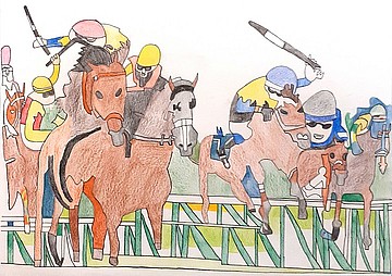 競馬のスタートの瞬間を描きました。馬の飛び出す迫力、スピード感を出す所が難しかったです。馬の筋肉や表情、騎手の姿勢を工夫しました。