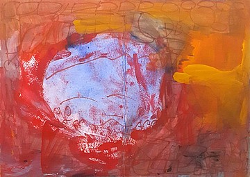 真ん中の青いまるは、心臓や命をイメージしました。周りの赤や黄色は、血や炎、熱いエネルギーを表しました。色が混ざり合い、生きていることそのものの力、神秘さを見て感じてほしいです。