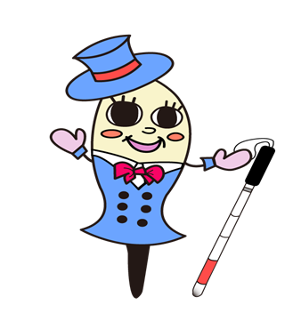 頭にはシルクハット、蝶ネクタイに、ワンピースを着ています。キャラクターの左手には、白杖があります。