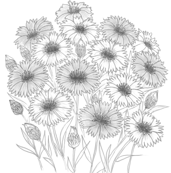 矢車菊の花が13輪さいています。つぼみは8個です。一輪の花に10~12個の小さい花が、中心から伸びていて、花の先は不規則に裂けています。花の色は、濃いものと薄いものが入り混じっていて、それぞれ7輪ずつ。花の合間からは、細長い茎と、細長い線形の葉がのぞいています。