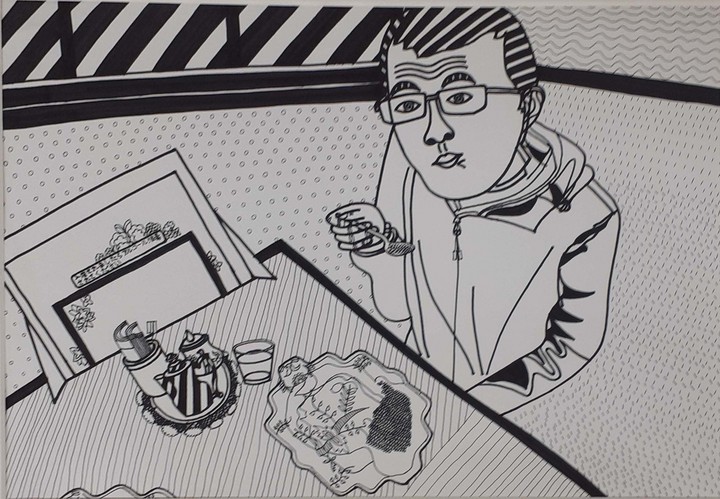 僕の絵は、景色、動物、似顔絵などの黒のマーカー、ボールペン、鉛筆をうまく使って