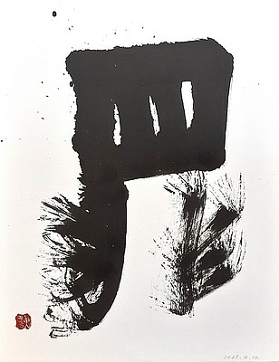 小学校で習う常用漢字の一字書作品を週に一度書道教室で作っています。一年生の漢字から始めて一年半が経ち、現在は六年生の漢字を書いています。今回は、使い慣れた筆で力強く書いた文字の勢い、点画の激しさで「罪」という文字を表現しました。